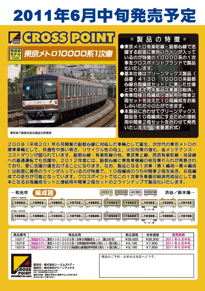 クロスポイントではグリーンマックス東京メトロ10000系の再生産に合わせて、オリジナル商品東京メトロ10000系1次車(基本となる8両セット増結用の2両セット)とグリーンマックス製品(品番:4130)東京メトロ10000系8両編成セットを10両編成にするための増結用中間車2両セットを発売いたします。