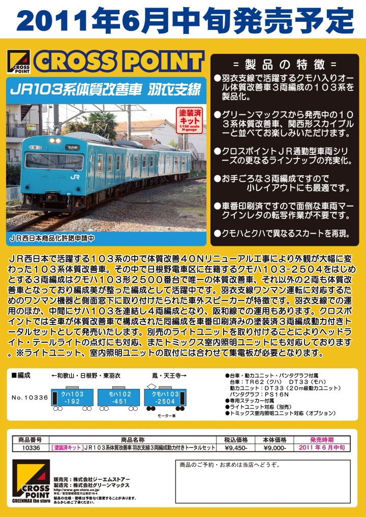 さてCROSSPOINT新製品のうち、発売のご案内が遅れておりました【JR103系体質改善車 羽衣支線用3両編成セット】の発売日が決定いたしました。